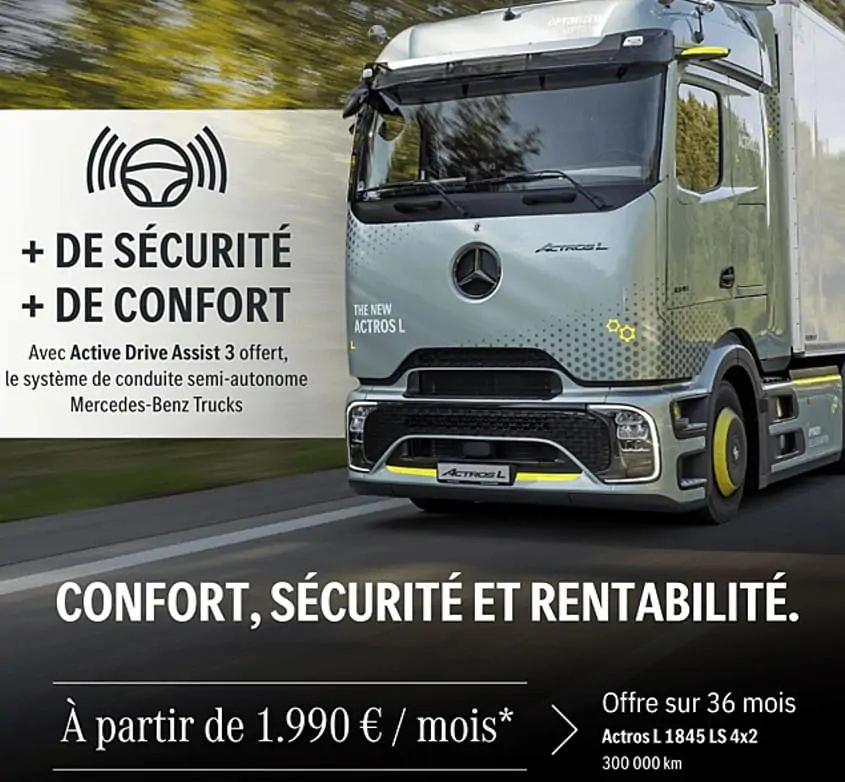 *Ces loyers comprennent les prestations et/ou les assurances accessoires et facultatives suivantes : ContratService : MB Complete avec MB Uptime Assurance : Perte Financière Garantie Perte Financière « GAP24-DTFS » souscrite par Daimler Trucks Financial Services, contrat d’assurance collectif facultatif N° 61.013.843, auprès de BALOISE SACHVERSICHERUNG AG, dont le siège est situé à Basler St. 4, PO box 1145, 61281 Bad Homburg v.d.H., Allemagne, par l’intermédiaire de MARSH SAS, société de courtage d’assurance, RCS 572 174 415 et immatriculé à l’ORIAS sous le N° 07 001 037, dont le siège social est : Tour Ariane, 5 place des Pyramides, 92800 Puteaux. ContratService souscrit auprès de Daimler Truck France, RCS 841 619 307, dont le siège social est situé 7, avenue Nicéphore Nièpce, 78180 Montigny-le Bretonneux. Cette simulation en Service Leasing (Produit Location Longue Durée) proposée par Daimler Truck Financial Services est valable jusqu’au 31/07/2026 et n’est pas une offre de financement. Elle pourra le devenir après acceptation du dossier par Daimler Truck Financial Services France S.A. Exemple de loyer pour un Mercedes-Benz Actros L 1845 LS 4x2 blanc Arctique, avec carénage latéral, aérodynamique, chauffage additionnel, climatiseur automatique, déflecteur à air réglable et déflecteurs latéraux, pare-chocs peints, système de navigation, PSM de 2e génération (hors option (s) additionnelle(s)).Visuel non contractuel. Le véhicule présenté est donné à titre d’illustration et peut différer des véhicules proposés dans le cadre de l’offre. Les loyers sont donnés à titre indicatif et varient selon le modèle et les options sélectionnées, les loyers définitifs sont ceux précisés dans la proposition commerciale remise par vos distributeurs : KROELY VI 57 - 94 A Boulevard Solidarité - 57070 METZ siren 429808702 N° ORIAS 7037004 / KROELY VI 68 - 228 Avenue de Fribourg - 68110 ILLZACH siren 946751211 N° ORIAS 7037740 / KROELY VI 54 - 698 Rue Georges Charpak - 54710 LUDRES siren 388065211 N° ORIAS 7036945 / KROELY VI 67 - 77 Rue des Vignes - 67202 WOLFISHEIM siren 451040463 N° ORIAS 9051253